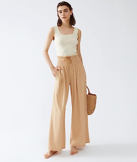 • 【Feature】The Beach pants for women are designed with solid color,with smocked big elastic waistband ,and front drawstring design, linen pants, high waist with elastic wide-legged pants for womens.